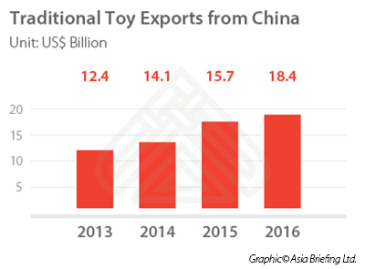 China is the world’s largest toy manufacturer, producing around 70 percent of the world’s supply. Total export value of toys reached US$33.7 billion in 2016. Of this, traditional toys, including dolls, puzzles, educational toys, etc., were valued at US$18.4 billion. Most of China’s exported toys are produced by OEMs who manufacture for foreign brands.
